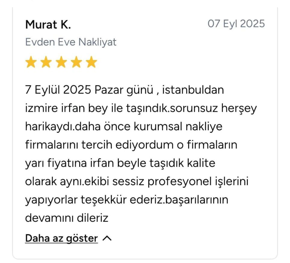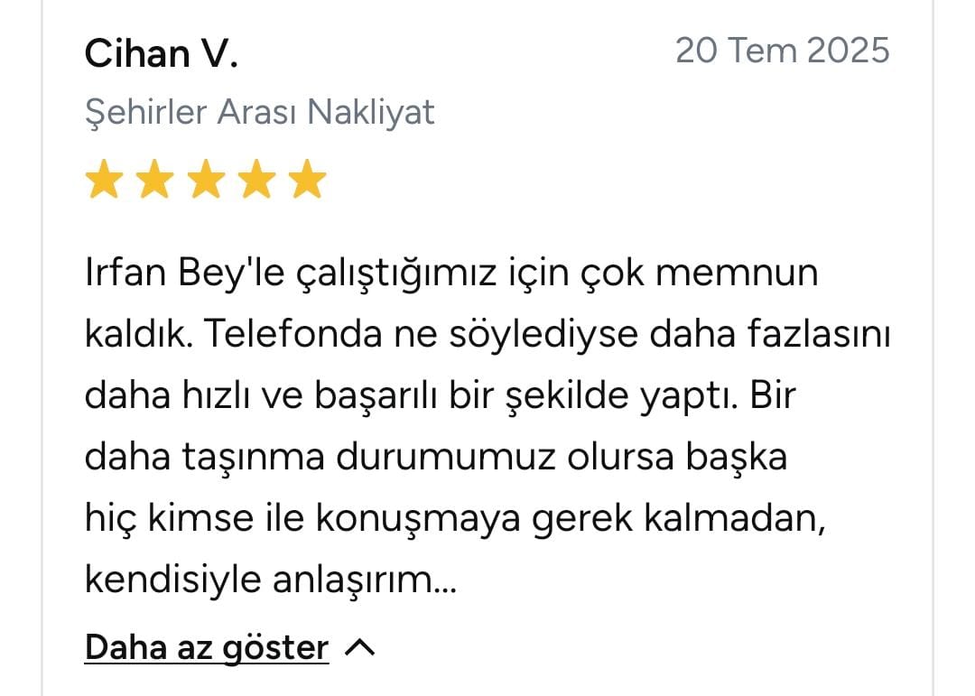 Müşteri memnuniyetini her zaman ön planda tutan firmamız, zamanında teslimat, şeffaf fiyatlandırma ve kaliteli hizmet ilkeleriyle çalışmaktadır. Taşınmanın stresli bir süreç olduğunun farkındayız; bu nedenle her aşamada planlı, dikkatli ve çözüm odaklı bir yaklaşım benimsiyoruz.